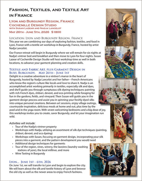 Our France retreat will begin in Burgundy where we will embark on a magical time with artist Nadja Lancelot, creating various fabrics using a variety of textile art techniques on silk. Cochenille's Susan Lazear will also host some workshops in Burgundy. We will explore the area and enjoy the best of French cuisine.